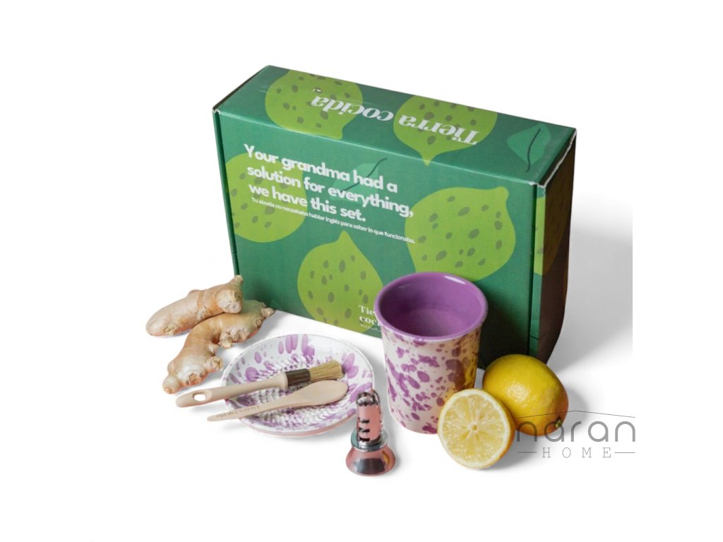 Sada obsahuje vše, co potřebujete k přípravě dokonalé zázvorové infuze – keramický strouhací talířek, který zázvor nastrouhá do jemné, krémové textury, ladící hrnek, ve kterém si nápoj rovnou připravíte i vychutnáte, lis na citron pro čistou šťávu bez pecek, štěteček na pohodlné setření zázvoru a dřevěnou lžičku na doladění každého doušku.